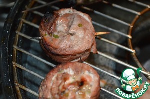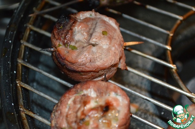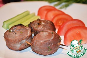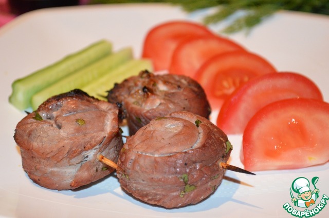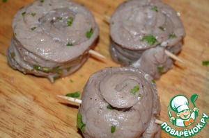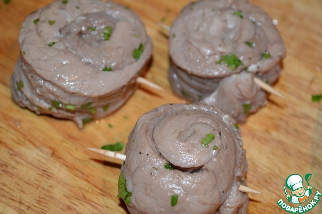 Когда мясо замаринуется туго свернкть его в улитку и заколоть зубочисткой.