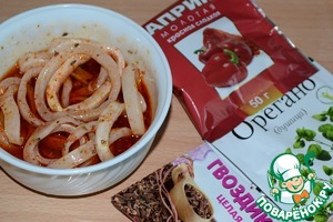 Перекладываем кальмары в маринад и ставим на два часа в холодильник.