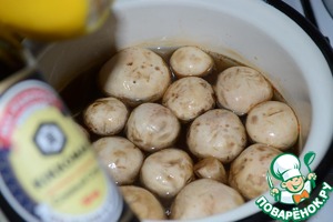 В кипящий маринад выложить грибы, добавить соевый соус, сок лимона.
