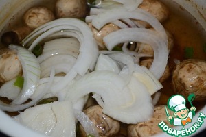 К грибам выложить репчатый лук, нарезанный кольцами. Проварить в течении 3-4 минут.