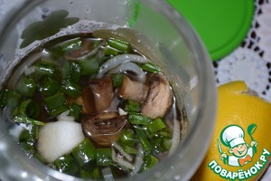 В банку с крышкой выкладываем шампиньоны вместе с маринадом, добавляем зеленый лук, даем настояться в течении 1-2 часов. Если у вас на пороге неожиданно гости, то мариновать можно и меньшее время, шампиньоны быстро впитывают в себя все вкусы.