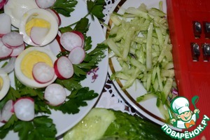 В салатник выкладываем петрушку, сверху яйцо нарезанное кружками, редис.