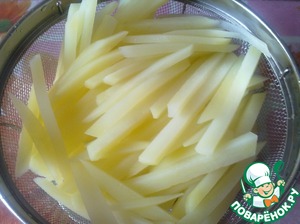 Картофель нарезаем острым ножом тонкой длинной соломкой и отвариваем 5 минут в кипящей воде.