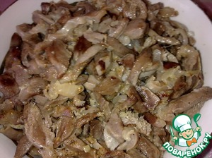 Обжариваем на растительном масле лук вместе с куриными желудочками до золотистости.
