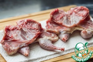 У перепелок вырезать хребты, это удобно делать кухонными ножницами. Выломать их немного, чтобы получился пласт. Помыть как следует и обсушить бумажным полотенцем.
