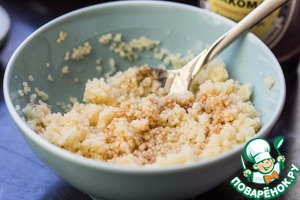 Подготовим салат. Для этого кус-кус залить кипятком, его может понадобиться чуть больше. Через 10 минут кус-кус увеличиться и станет мягким. Заправим его маслом и соевым соусом. При необходимости немного посолить.