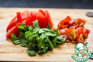Помидоры, шпинат и перцы нарезать на небольшие кубики. Смешать с кус-кусом.