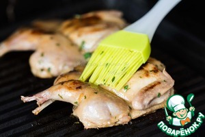 Маринованные перепелки обжаривать на гриле, периодически переворачивая минут 20-25. В процессе смазывать остатками маринада. Так же их можно приготовить на углях.
