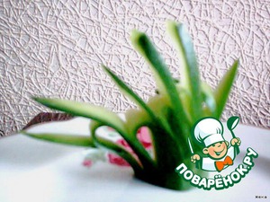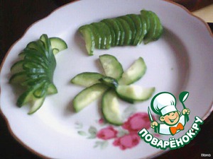 Часть огурца режем вдоль на лепестки. И проделываем вариант, который был. Получается в виде короны. И, комбинируя разные заготовки, создаем наше украшение.