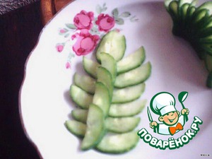 Остаток огурца просто шинкуем очень тоненько и выкладываем листочек (или что фантазия подскажет).