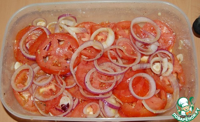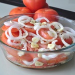 Далее берем посуду, лучше всего - пластиковую. Выкладываем слоями помидоры, затем лук и чеснок - и так поочередно.