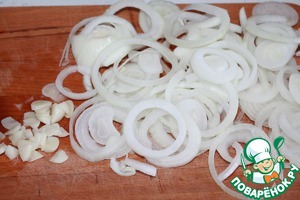 Лук - кольцами. Чеснок - произвольно.