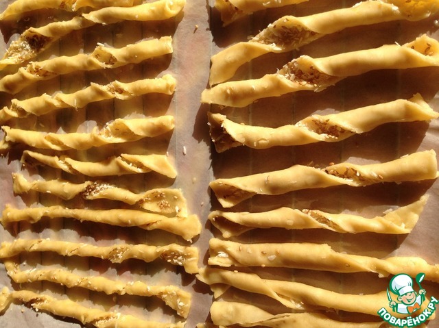 Комментарии по приготовлению- 1) у меня муки ушло чуть больше (где-то 200 г), а то тесто жидковатое было. Видимо, мука разная бывает. 2) из пластов 15 см получаются маленькие (на мой взгляд)палочки, поэтому я раскатала всё тесто в 1 лепешку и всю её порезала на полоски шириной 2 см. Вышли полоски где-то по 30 см, в итоге палочки в накрученном на карандаш виде получились в самый раз. 3) духовки у всех, видимо, разные. У меня на запекание ушло где-то 45 мин.4) указанной порции продуктов хватило как раз на 1 противень палочек. На среднюю семью в самый раз. А вот если гости, порцию лучше удвоить (как минимум).