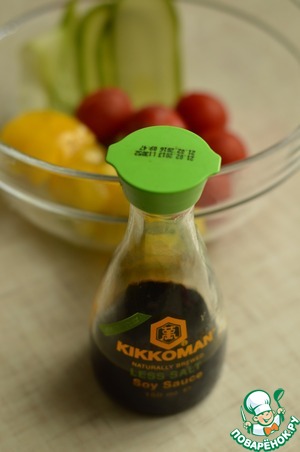 1. Кабачок нарезать тонкими полосками, перец небольшими кубиками, помидоры проткнуть зубочисткой в нескольких местах. Сложить все в чашку, добавить соевый соус, масло, бальзамик, перец, перемешать. Можно добавить еще трав по своему вкусу. Оставить мариноваться овощи 10-15 минут.