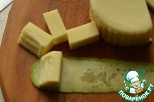 2. Сыр нарезать брусочками. В пластинки кабачка завернуть сыр. На шпажки, я брала маленькие, нанизать помидор, затем кабачок с сыром, затем перец и снова помидор.