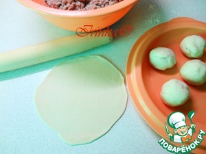 Делим тесто на кусочки весом 45-50 г, раскатываем их в тонкую лепешку. -