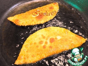 На сковороду наливаем масло слоем два-три см, хорошо нагреваем и обжариваем чебуреки по несколько минут с каждой стороны, до золотисто-коричневого цвета.