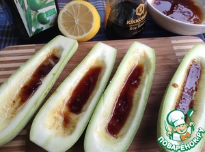 Молодые кабачки разрезаем вдоль, вынимаем ложкой мякоть,