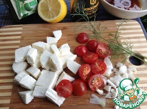 Нарезаем адыгейский сыр (он пресноватый и с благодарностью впитает весь аромат и вкус соуса, зелени и чесночка),