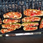 Тем временем промаринованные кабачки выкладываем на мангал выемкой вниз.