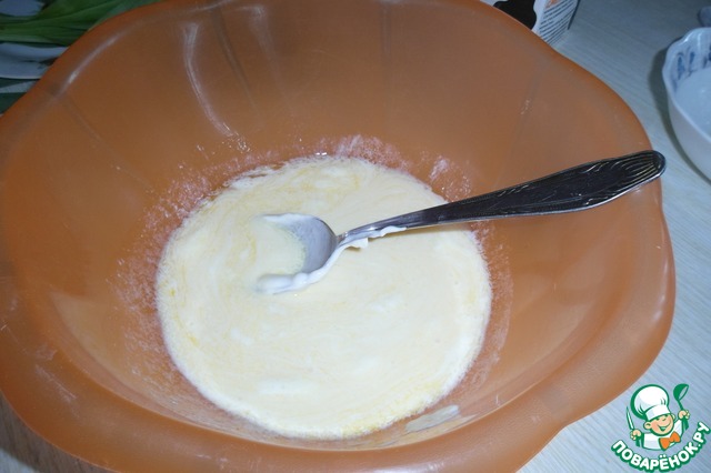 4. Делаем заливку. Взбиваем яйца, добавляем сметану, муку и укроп.