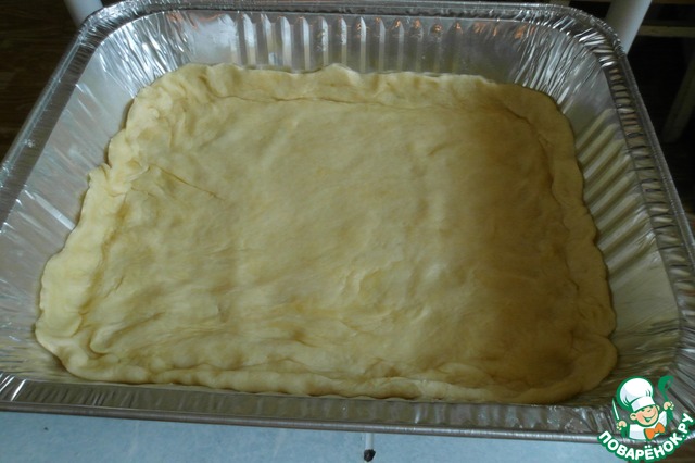 5. Готовое тесто раскатываем толщиной 0,5см и укладываем на противень.