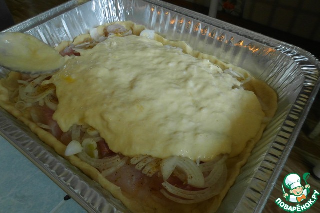 6. Сверху раскладываем рыбное филе и лук, солим, перчим и равномерно распределяем подготовленную заливку.