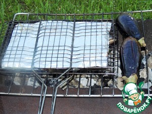 Пока заведующий мангалом готовит основное блюдо, положить рядом на решетку баклажаны. Они запекутся за 10-15 минут.