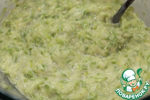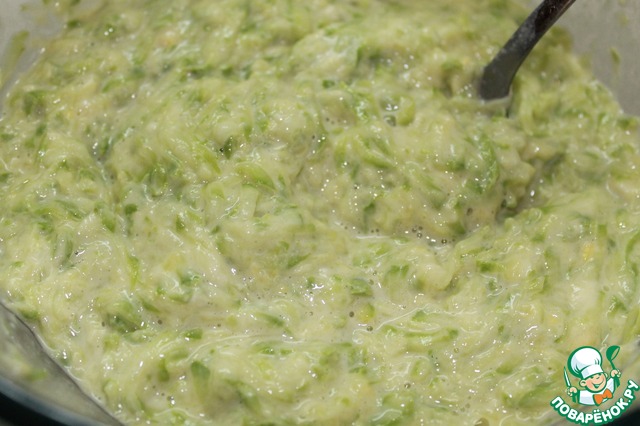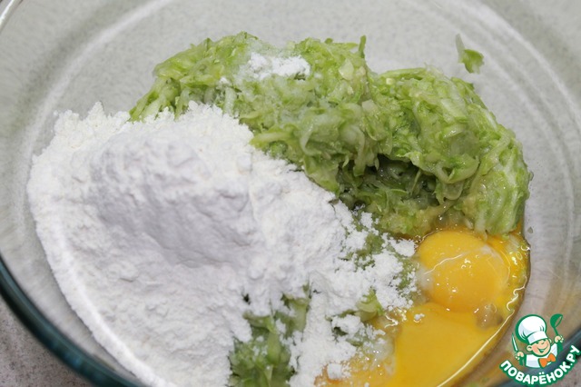 Натираем кабачки на крупной терке и сок отжимаем, но без фанатизма. Белки отделяем от желтков. Соединяем кабачки, муку, желтки, соль, перец