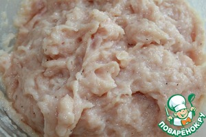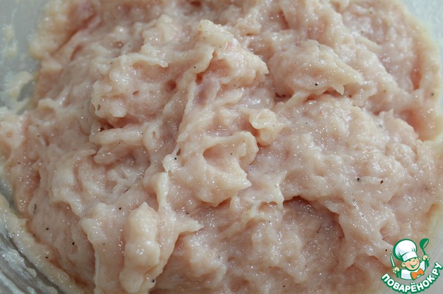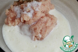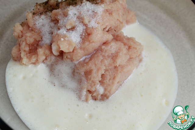 Белки взбиваем до пены. Соединяем фарш, белки, молоко, соль, перец