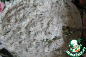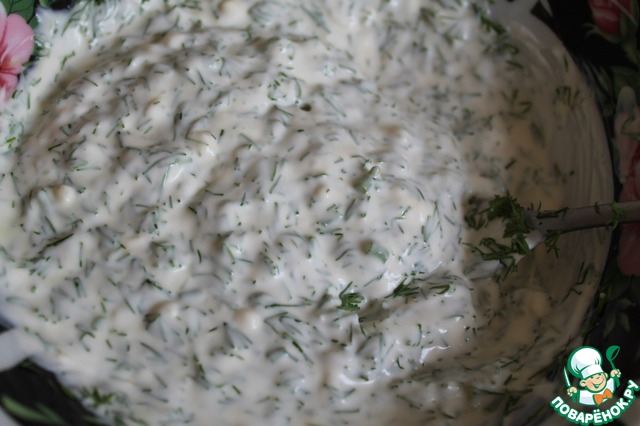 Соединяем майонез, зелень, чеснок (на чесночницу) - это крем