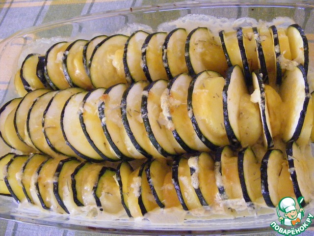 Укладываем кабачки и картофель в форму, чередуя кружочек кабачка с кружочком отварного картофеля. Тут одно маленькое примечание: лучше всего, чтобы кабачок и картофель были примерно одинакового диаметра. В итоге получается так, как на фото. Моя форма не очень большая, Д 22см* Ш 14см* В 5см.