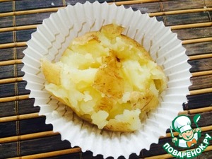 На месте среза картошки делаем неглубокий надрез крест-накрест. Толкушкой для пюре слегка приминаем картошку. На фото видно: картошечка немного "расползается". Надрез же нам нужен, чтобы картошка "расползлась" равномерно.
