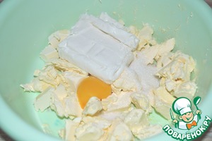 Рубим маргарин ножом, смешиваем его с желтком, содой и творожной массой и 2 ст. л. сахара.