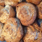 Рулет режем на кусочки толщиной 1-1,5 см. Сразу скажу, что начинка будет вытекать, но когда я уложила кусочки на противень, то собрала начинку и смазала ей верх печенья.