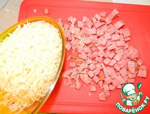 Добавить сыр и колбасу. Хорошенько перемешать.