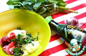 Туда же добавить чеснок, выдавленный через пресс, мяту и маринованный имбирь.
