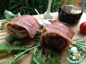 Завернули гриб в бекон и нанизываем его на шпажку.