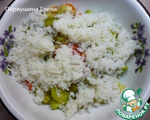 Смешиваем вареный рассыпчатый рис с готовыми овощами.