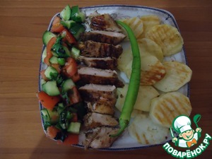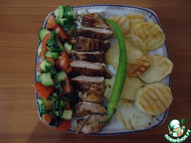 Прошло час, грудки ставим на разогретую гриль. Блюдо готово, подаем с картошкой на гриле. Украшаем помидорами огурцом и перцем.
