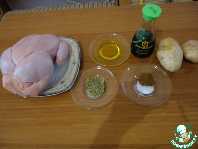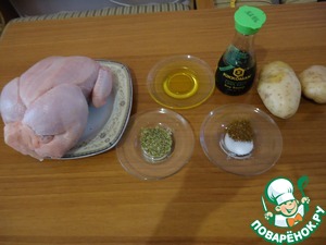 Нам понадобиться грудка курицы, соевый соус, подсолнечное масло и приправы. Картошка сейчас нам не нужна, мы используем картошку как гарнир к куриной грудке.