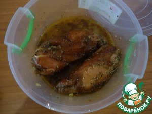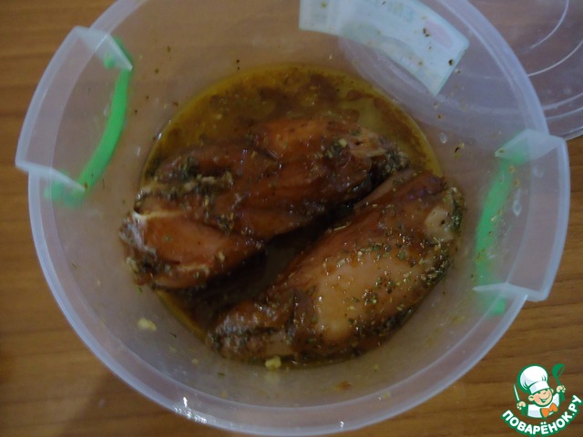 Подсолнечное масло, соевый соус, приправы и куриное грудка все перемешаем и ставим в холодильник на час.