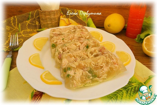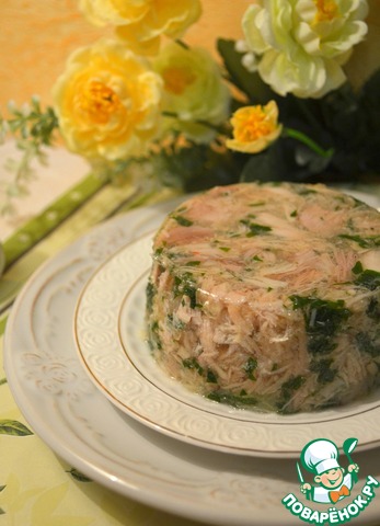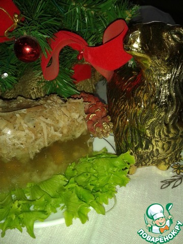 11. В неглубокие тарелки разберите пальцами свинину (только мясо, копытца я не кладу, хотя многие любят) на волокна и курицу, чтобы не попали мелкие косточки и хрящи. (У меня получается по 1 куриной ножке на тарелку). Залейте немного жидкости, выдавите в каждую тарелку по зубку чеснока. Дайте жидкости застыть в холодильнике. Украсьте каждую тарелку зеленью и маслинами, приклеив их к застывшему первому слою. Теперь аккуратно налейте жидкость до края тарелки и поставьте застывать. Как только холодец застынет, накройте его пищевой пленкой и уже в таком виде храните до прихода гостей в холодильнике. Получается 4-5 неглубоких тарелочек.