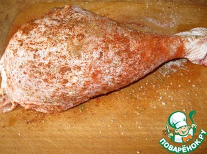 Вообще намеревалась запечь просто целиком, а на следующий день надумала фаршировать. Поэтому, рекомендую обтирать специями уже разделанную ножку. Уложить в 2 пакета или обмотать пищевой пленкой и-в холодильник на 2 ч. Я оставила на сутки.