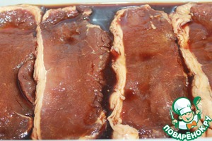Приготовления начинаются на ночь. Мясо должно мариноваться минимум 6 часов. Мясо у меня стейки свинины, которые мы моем, сушим салфеткой. Выкладываем в пластиковую форму.
