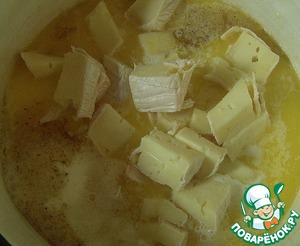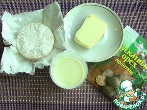 • Для соуса нам понадобятся следующие продукты: сыр камамбер, сливки, масло сливочное и мускатный орех и соевый соус.