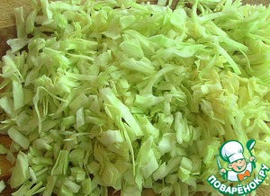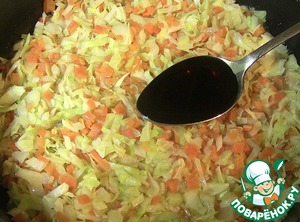 К луку добавляем капусту и морковь, немного обжариваем. Добавляем 2 ст. л. соевого соуса и хорошо перемешиваем.