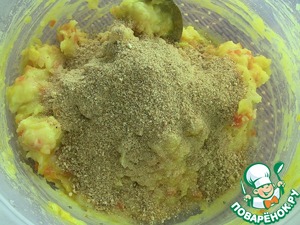 Добавляем панировочные сухари, масса должна стать густой, чтобы могли формировать котлеты. Ставим на час в холодильник.