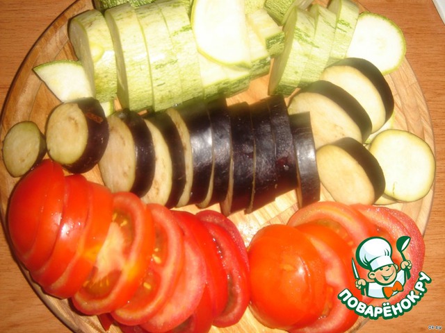 Кабачок, баклажан и помидоры режу кружочками. Кабачок потолще, баклажан чуть тоньше. Если овощи толстые, можно разрезать кружки еще пополам.