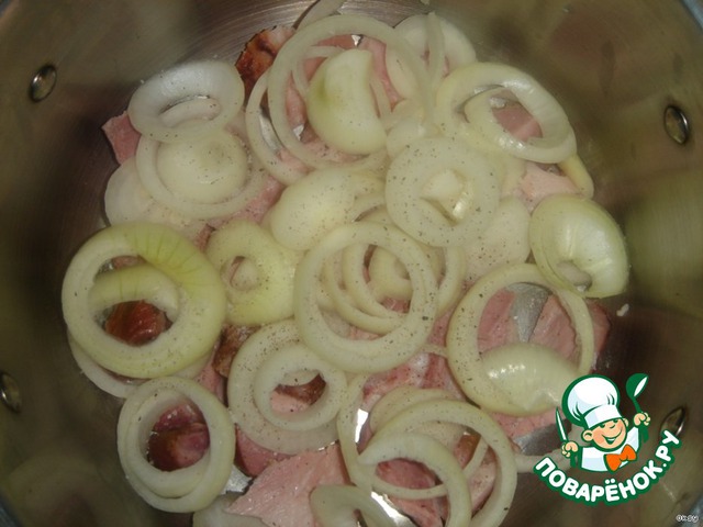 Сначала на дно кладу половину мяса, его порезала кусочками. Поскольку в мясе есть прослойки сала, то никакого масла на дно не добавляю. Сверху на слой мяса выкладываю кружочки лука. Слегка солю и перчу. -